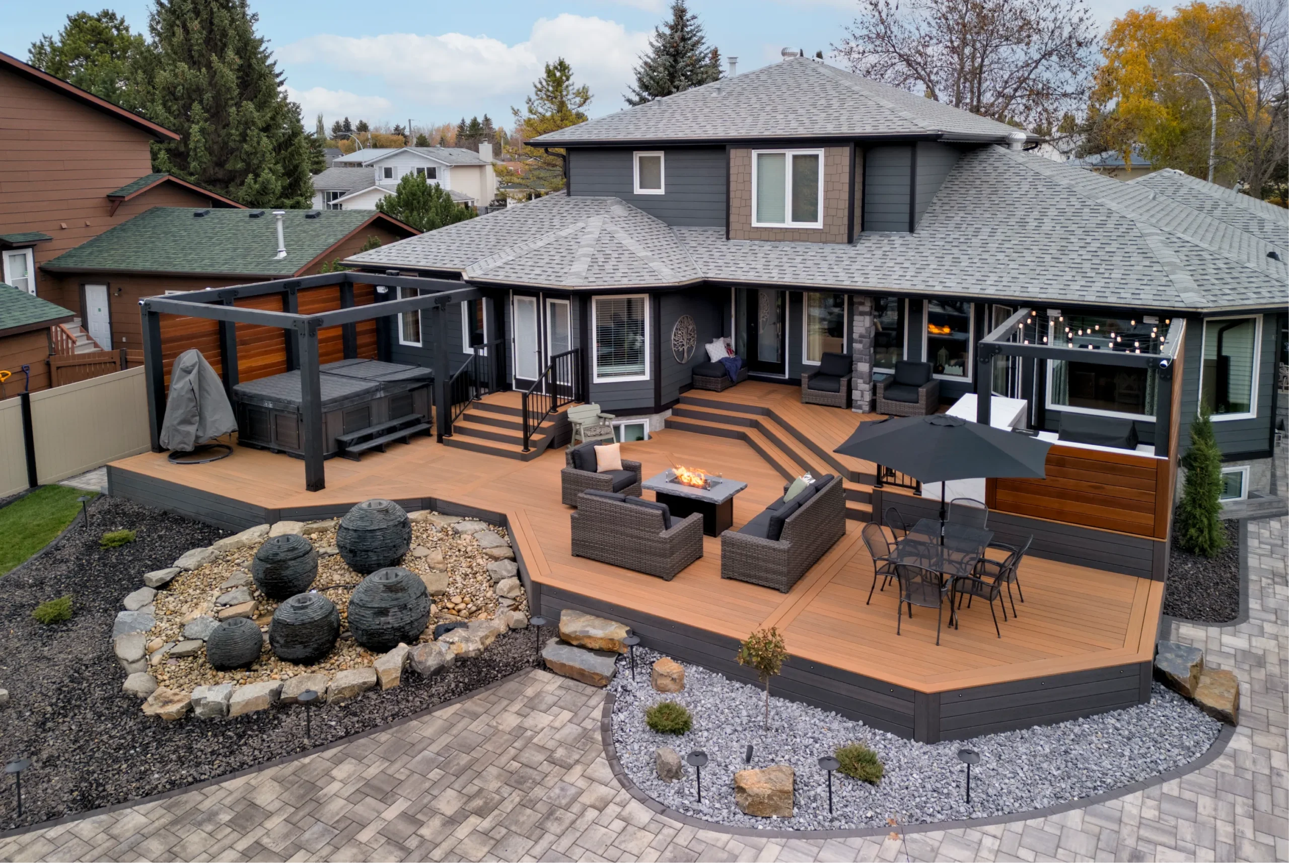 Every project is crafted with care from the ground up. It starts with a solid foundation. Whether it’s concrete or screw piles, we ensure the deck sits on a sound base. Next comes the framing, where we ensure each beam and joist is nailed to meet and exceed Alberta building code. Finally, we add top boards and railings which are installed with precision to give you a beautiful finished product.