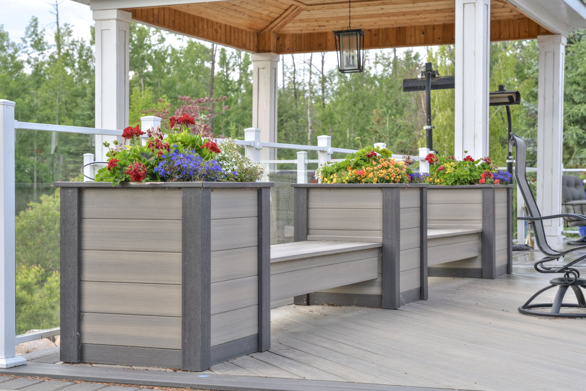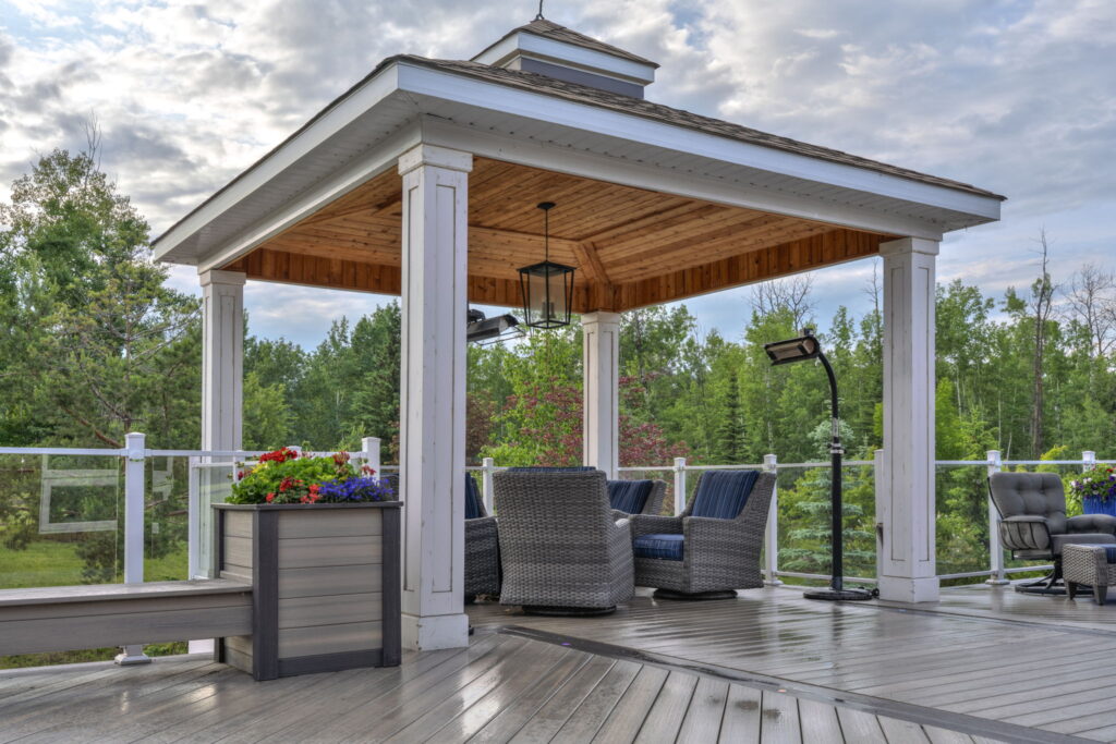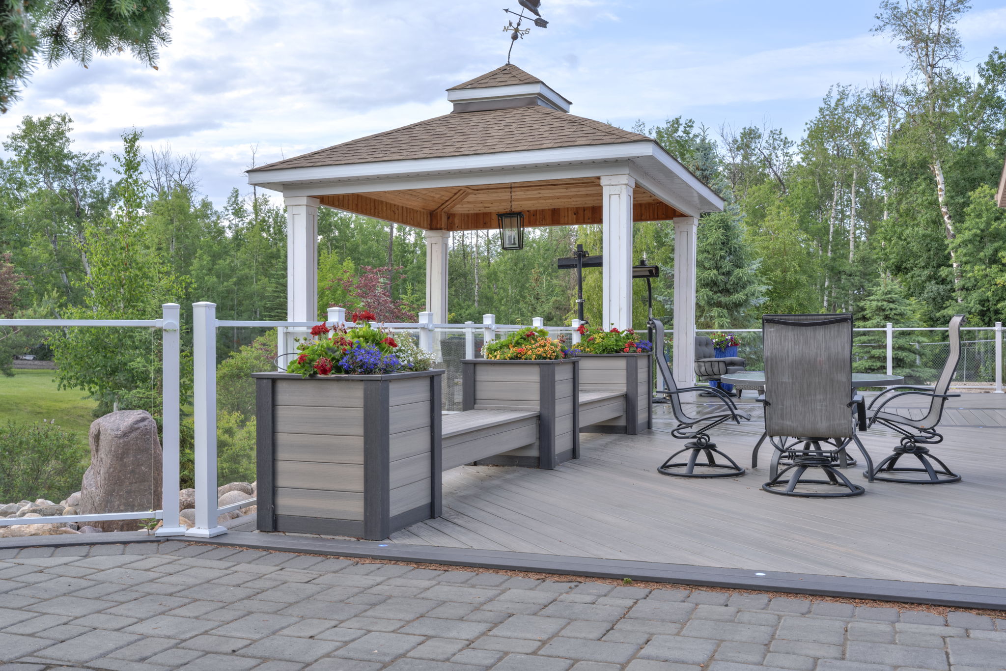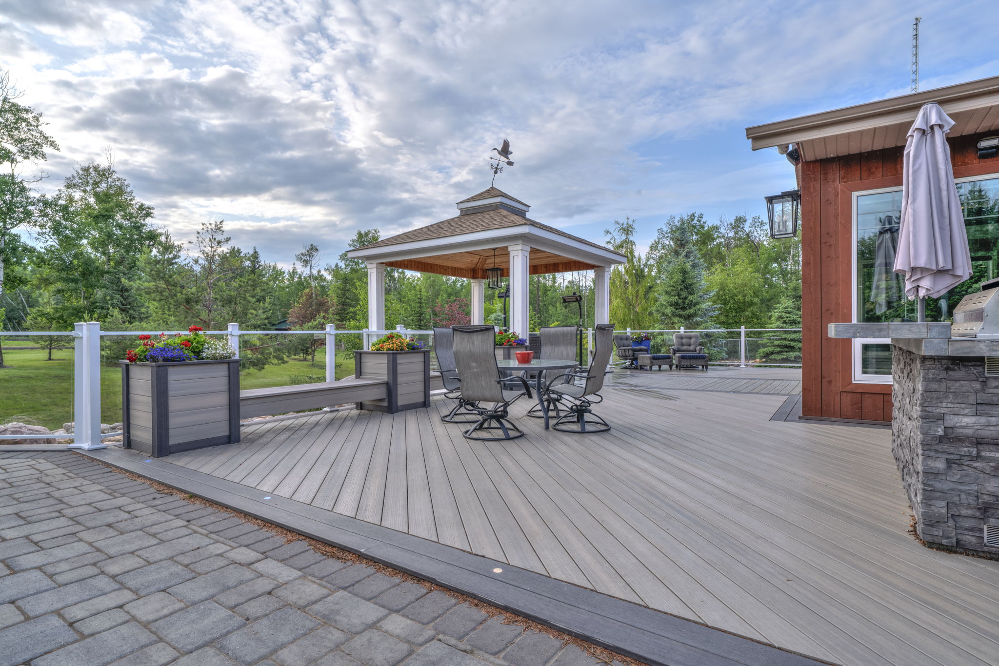 Larry had a small, old cedar deck that he wanted to update into an over-the-top masterpiece. We designed the whole project, and he loved it! Due to his location, we did 20 feet engineered screw piles to start off, with 2×12 beams. We used joist tape to ensure the frame will last as long as the PVC boards. He chose Fiberon PVC Flagstone, with the borders and splines in Composite Graphite. To give this unique look, the deck boards on the sides are diagonal with a parallel walk from the house to the gazebo. We installed custom glass and aluminum railing, and custom deck lighting. We built a pressure treated custom gazebo, wrapped in PVC, with a cedar tongue and groove ceiling, and PVC skirting. We also designed custom planters with built-in bench seating and a built-in BBQ to finish it all off!