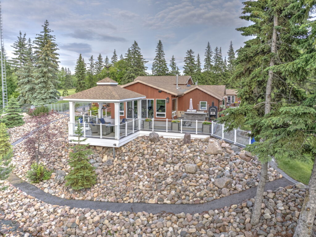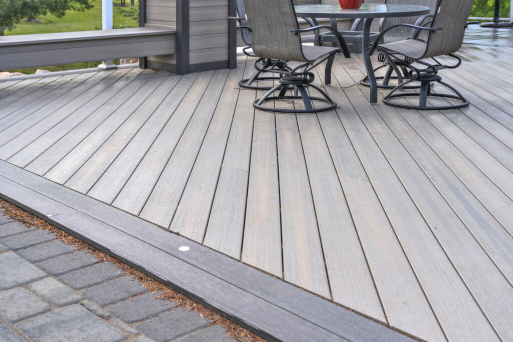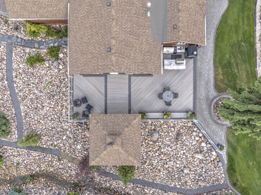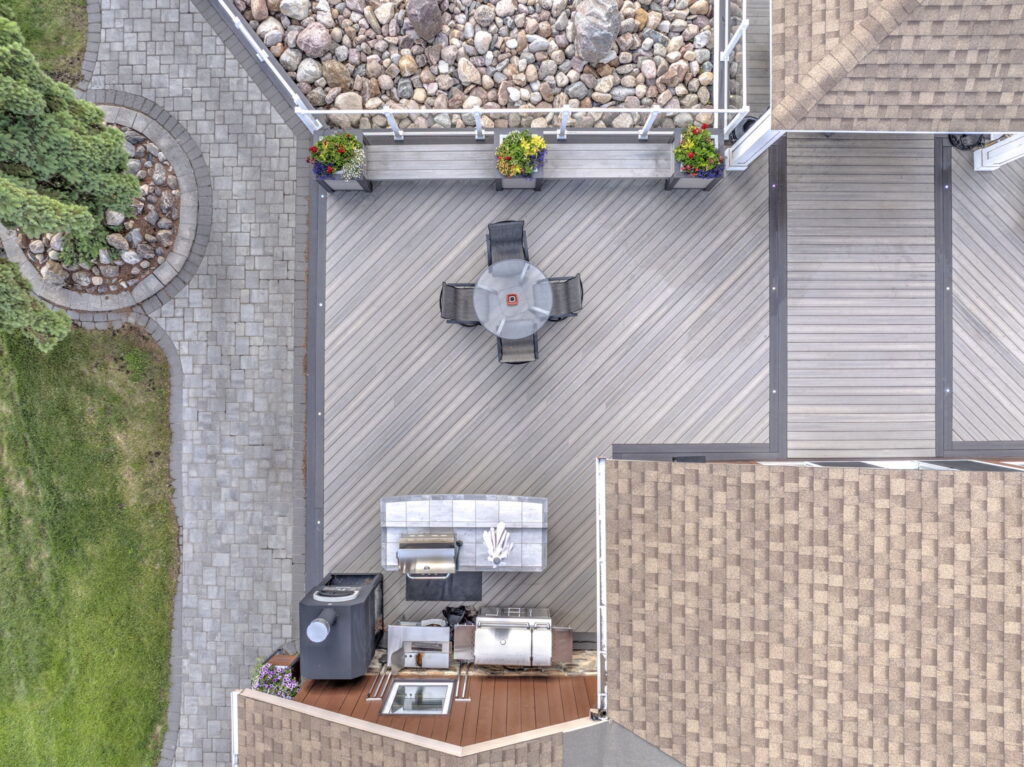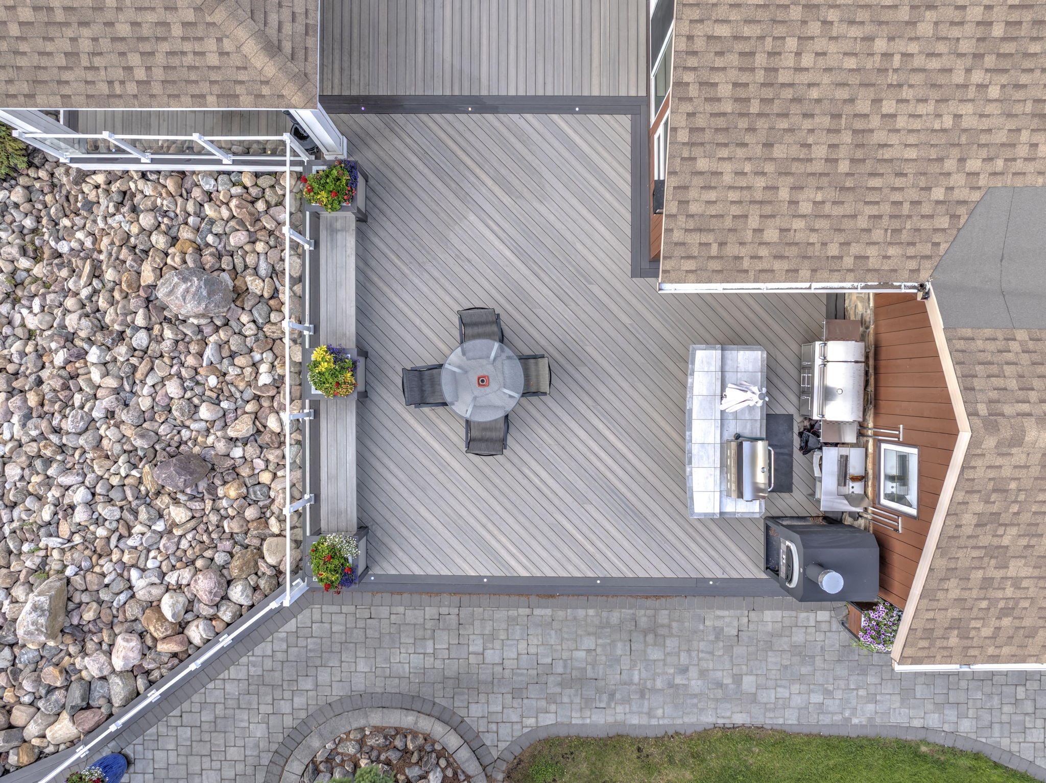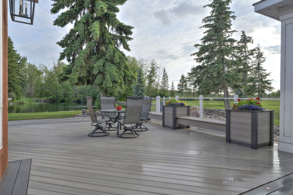 Larry had a small, old cedar deck that he wanted to update into an over-the-top masterpiece. We designed the whole project, and he loved it! Due to his location, we did 20 feet engineered screw piles to start off, with 2×12 beams. We used joist tape to ensure the frame will last as long as the PVC boards. He chose Fiberon PVC Flagstone, with the borders and splines in Composite Graphite. To give this unique look, the deck boards on the sides are diagonal with a parallel walk from the house to the gazebo. We installed custom glass and aluminum railing, and custom deck lighting. We built a pressure treated custom gazebo, wrapped in PVC, with a cedar tongue and groove ceiling, and PVC skirting. We also designed custom planters with built-in bench seating and a built-in BBQ to finish it all off!